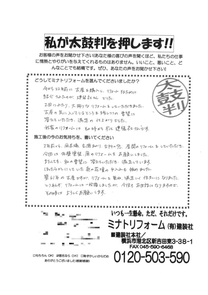 「MMさん。今回は、当店ではじめての塗装工事でしたが、ご信頼くださり、誠にありがとうございました。