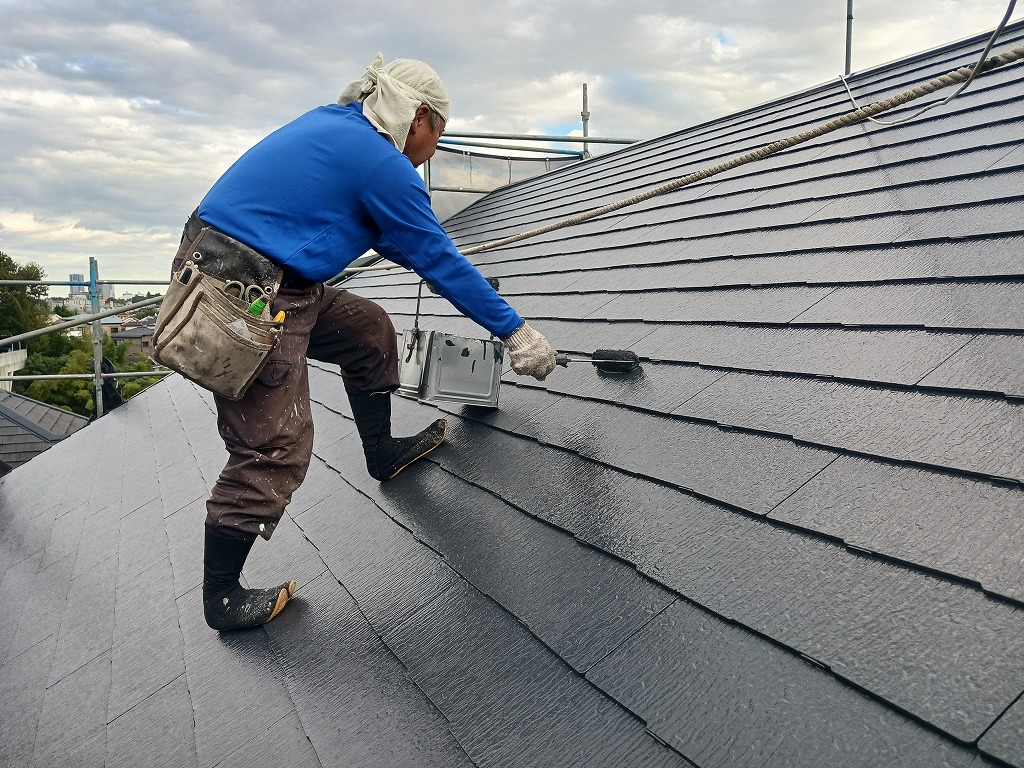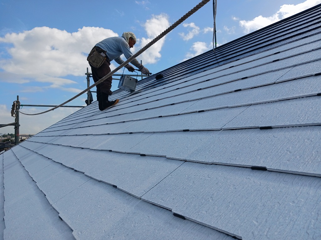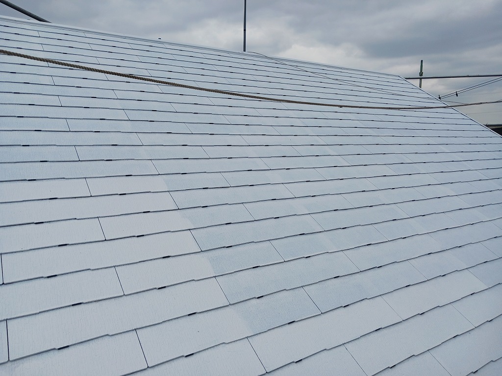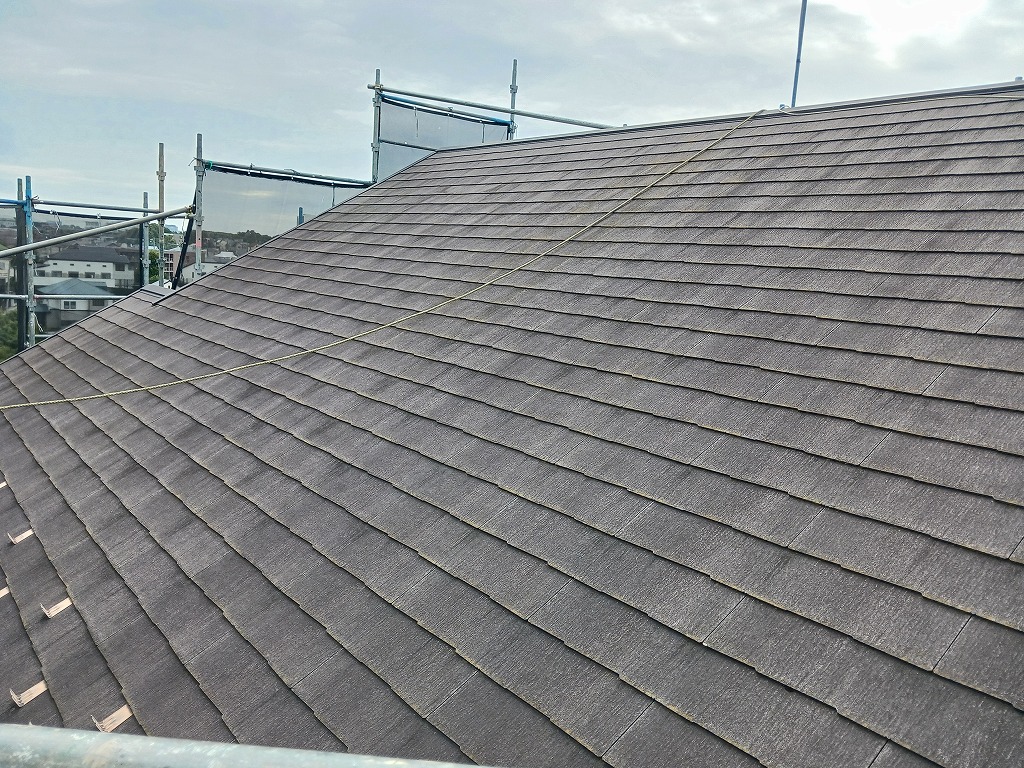コロニアル屋根が、すっかりと、塗装職人の手塗りで元通りになりました!今回は2回で完成しましたが、2回でもまだ完成できないこともあります。(業界語では、”止まらない”と言いますが、どんどん屋根に吸い込まれれしまっていく状態です)