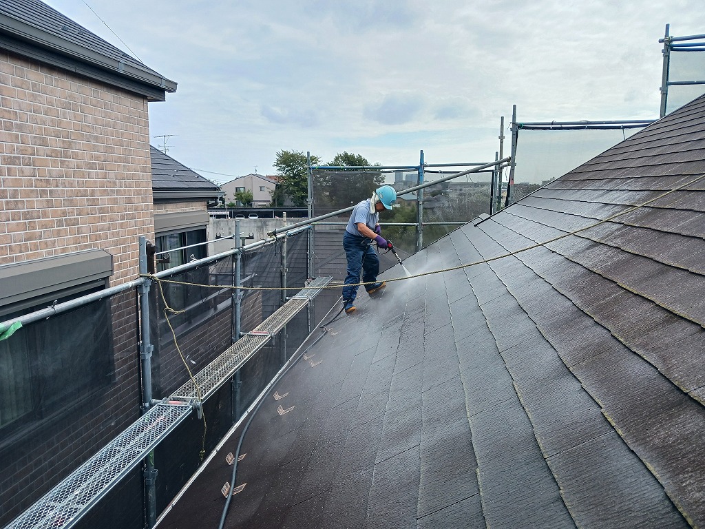 まず、塗装の前に高圧洗浄で、コケや汚れ、黒ずみ、旧塗膜等をしっかり落としていきます!高圧洗浄でしっかりと旧塗膜や汚れを落としておくことで、塗料の密着性を良くする効果を発揮できるからです。