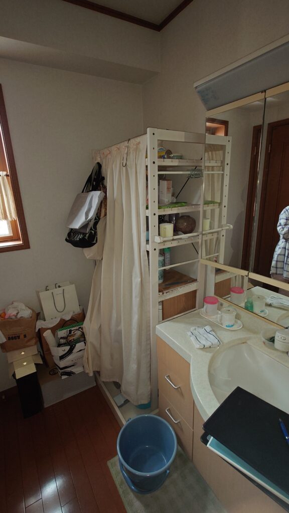 洗面化粧台横には洗濯機の防水パンと洗濯機用の水栓金具がついていたのですが洗濯機は別の場所に置いてある為スペース利用として市販の収納を置いていました。しかし、扉がないのでカーテンを付けて扉代わりに使用していました。そして収納しきれない物があふれている状態でした。