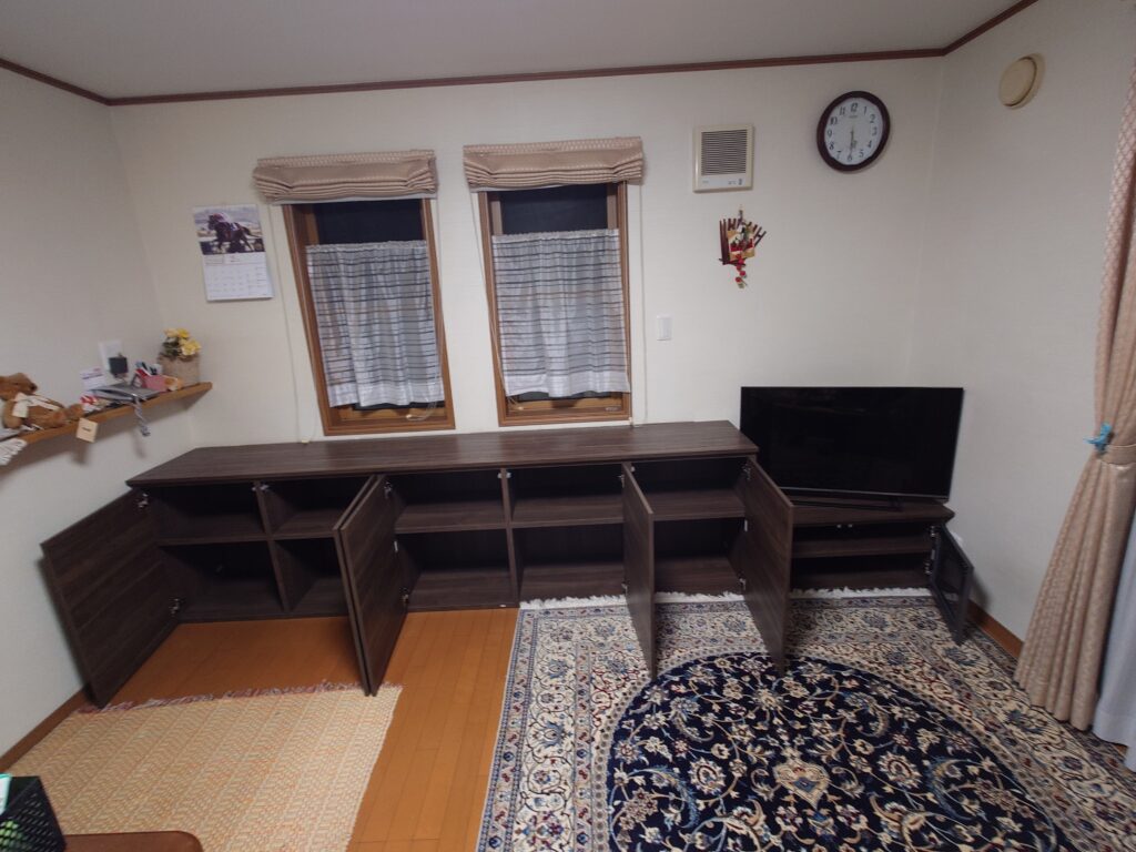 リビングには収納家具が設置してありましたが、扉がない部分があるので収納内部が丸見えになってしまっていました。今度は扉がある収納にしてほしいとのご要望でした。