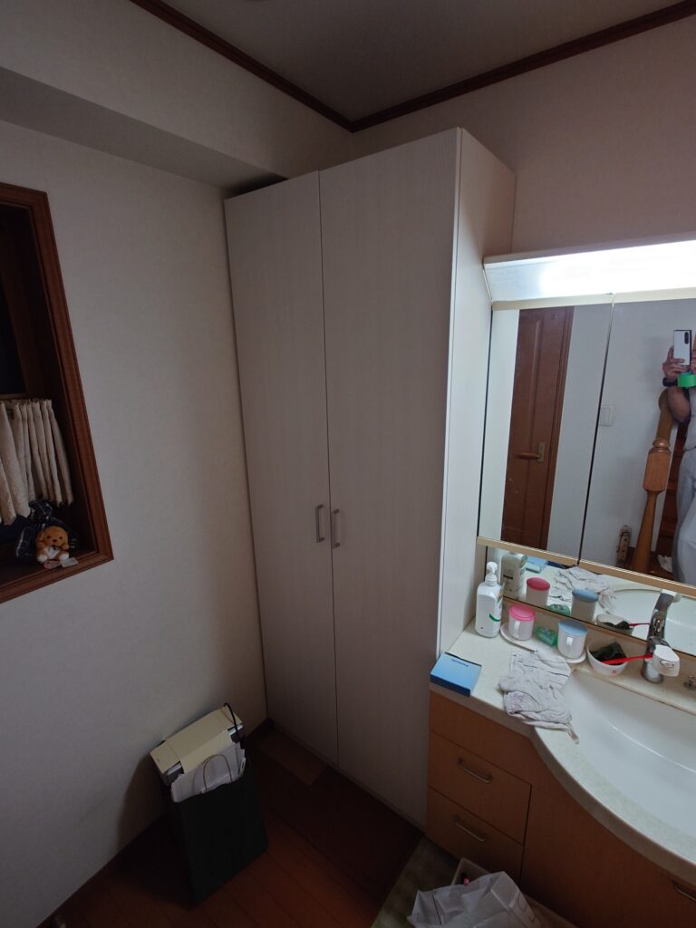 洗面台横には洗濯機防水パンと水栓金具は撤去し、新しく可動棚付きの収納を設置しました。収納力がアップし、扉が付いているので中も見えません。