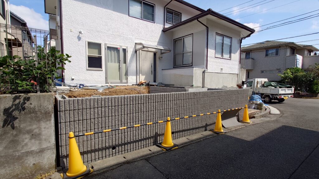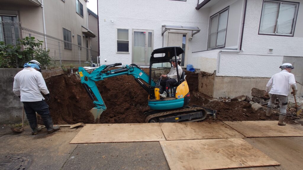 古い大谷石の擁壁は撤去して2m近い高さまで耐えられる擁壁ブロックを敷設します。その前に基礎をしっかりと打設する必要がありますので重機を使用して基礎の厚みをを確保するために土砂を撤去します。
