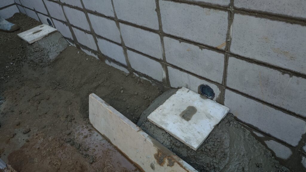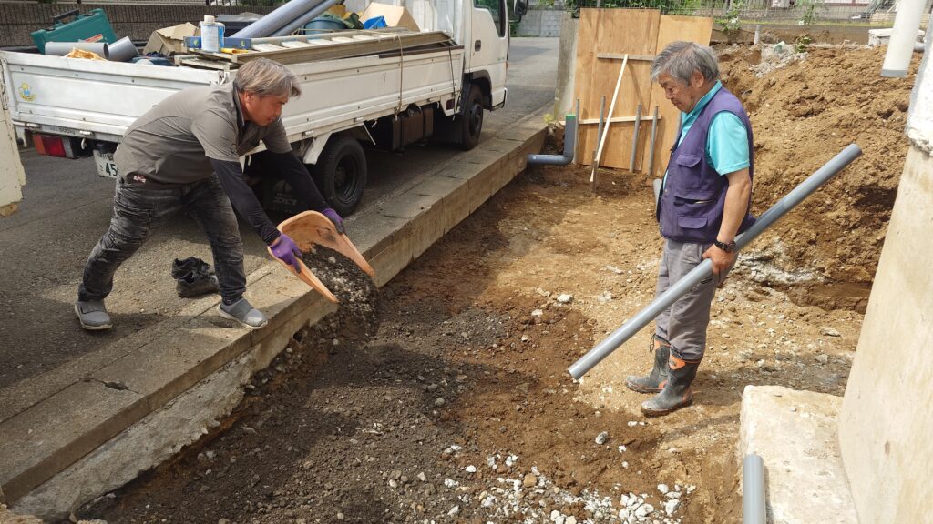 雨が降っても水たまりにならないように水抜き穴も2カ所設置いたしました。基礎や土壌の保護にもなりますので大切です。