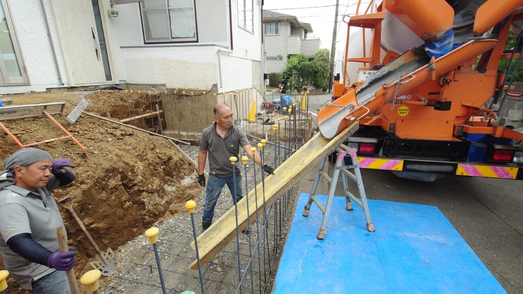 コンクリートミキサー車から直接コンクリートを流し込みます。
