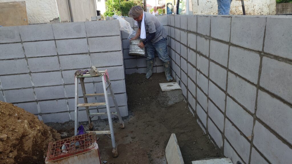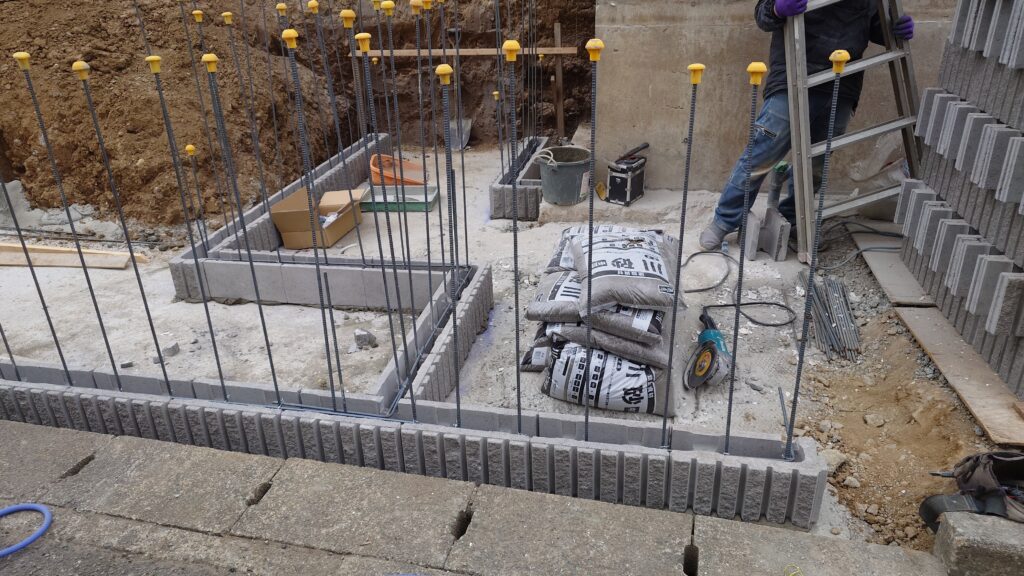 基礎が固まったらエスビック製の擁壁ブロックを積んでいきます。