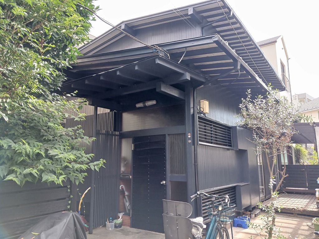 軒天井はホワイト、壁は濃い色のミッドナイトグレーのツートーンで綺麗に仕上がりました。
